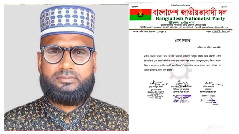 দলীয় সিদ্ধান্ত অমান্য ও সংগঠনবিরোধী কর্মকাণ্ডে জড়িত থাকার অভিযোগে শ্রীমঙ্গল পৌর বিএনপির এক নেতাকে দল থেকে অব্যাহতি দেওয়া হয়েছে। দলীয় এক প্রেস বিজ্ঞপ্তিতে জানানো হয়, শ্রীমঙ্গল পৌর বিএনপির ২নং ওয়ার্ড কমিটির সদস্য মো. আলতাফুর রহমান নাজমুল হাসানকে বাংলাদেশ জাতীয়তাবাদী দল (বিএনপি) প্রাথমিক সদস্য পদসহ সকল পর্যায়ের পদ থেকে অব্যাহতি প্রদান করা হয়েছে।